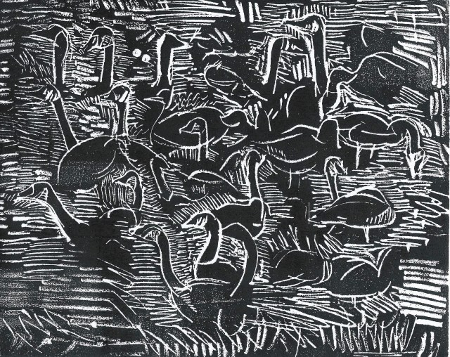 Geese by the River, by Jacqueline Perry. A print made by drawing with a stick on a styrofoam sheet, inking the sheet and printing the image on paper.